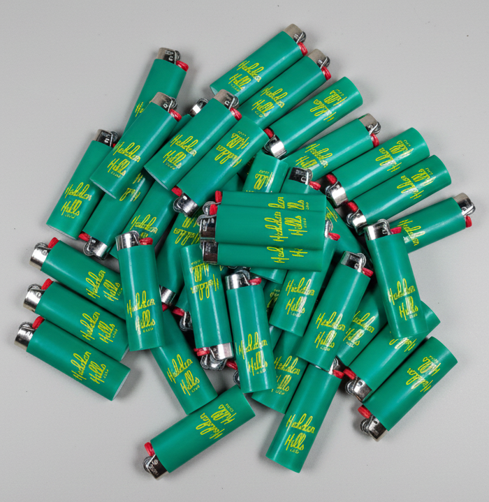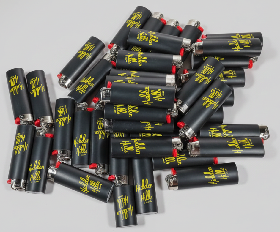 🚩 Encendedor Hidden Hills: Diseño en negro mate o verde con el logotipo "Hidden Hills Club" en contraste amarillo, ofreciendo un agarre ergonómico y un encendido confiable.